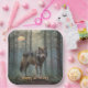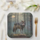 Estos platos de papel para fiestas de cumpleaños presentan un guapo lobo en un mágico bosque nublado. El texto se puede cambiar o eliminar.