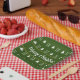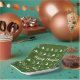 El plato de papel es verde forestal. Tiene un patrón hecho de árboles de Navidad y una imagen de pantalla. Puede reemplazar la imagen de pantalla con el logotipo de su empresa. Un elegante guión blanco dice Feliz Navidad.