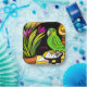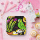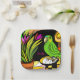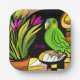 Dibujo caprichoso de loro verde. Gracioso loro amazónico con tulipanes rosas, un gorra panama y colores naranjas brillantes, amarillos y marrones. ¡Colorida y feliz tarjeta de visita!