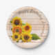 Toda la dura belleza de los girasoles se acompaña en un rincón de un marco rústico de madera. El diseño tiene tonos ocres mutados, amarillos brillantes, rosa y verde