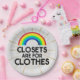 El material de fiesta con temática de orgullo gay presenta un gran arco iris con "los armarios son para la ropa" en negrita texto negro sobre fondo gris claro con estrella de oro