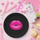 Placas de papel con un dibujo de un par de brillantes labios femeninos rosados sobre un fondo negro.