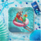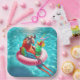 En una piscina azul brillante, con gafas de sol y tomando un cóctel, hay un macao sobre un anillo inflable rosa