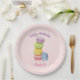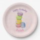 Placas personalizadas de papel de cumpleaños felices. Diseño acuático de macarons dulces y deliciosos apilados unos encima de otros. colores pastel bonito: violeta, verde limón, amarillo, rosa y azul. Colocado en un fondo rosado de puntos polka.