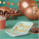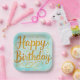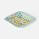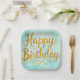 Estos platos de papel fiesta presentan una impresionante acuarela de feliz cumpleaños en azul acuático y oro.