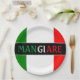 Este plato fiesta personalizado incluye la frase "mangiare" impresa en el centro. Mangiare es la traducción italiana para "comer" y está impresa en los colores de la bandera de Italia. Las tres primeras letras son verdes, las dos son blancas y las tres últimas son rojas. Está impreso en la bandera italiana.