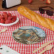 Estos platos de papel cuentan con una cabaña de azúcar de arce en Parmelee Farm en Killingworth, Connecticut.