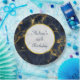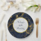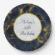 Placas de papel personalizadas para un cumpleaños u otro evento. Diseñado con un elegante y elegante fondo de mármol azul marino y dorado. En la parte superior hay un círculo con un borde de Relieve metalizado de oro falso con el texto personalizado en el interior.