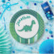 Dinosaurio sonriente lindo en marco redondo. Dino de nombre personalizado, azul verde, verde azulado patrón colorido para los niños