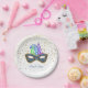 Este plato de papel se muestra en blanco con estrellas doradas con una estampilla festiva de carnaval de Mardi Gras. También ofrecemos una servilleta de papel a juego. Personalizar este artículo o compra tal cual.