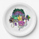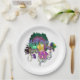 Juego de ocho placas de papel de 9" con una imagen festiva del Mardi Gras de un alce de plumas morado y verde detrás de máscaras de plumas moradas, un gorra secuenciado por fuchsia, cuentas verdes y moradas, globos morados, verdes y dorados, y dos corazones de amatista morado. Vea el frasco de caramelo, taza de espresso, matraz, jarra, jarra, vidrio de disparo, tetera y tiras acuáticas. Ver toda la colección de Placas del Mardi Gras en el FOOD/BEV | Sección de platos.