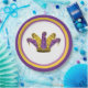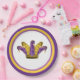 Mardi Gras Jester Gorra con arlequín patrón en morado y oro. La placa también tiene la frontera púrpura y la diana.