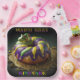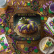 Presenta tu delicioso pastel de Rey Mardi Gras con escarcha morada, amarilla y verde y una pequeña corona.