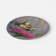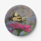 Este plato de papel presenta un hermoso néctar de mariposa de cola de hembra de crujiente de una flor de zinnia rosa.