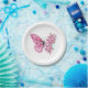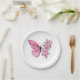 Arreglo floral de mariposa rosa con flores japonesas de cerezo rosadas sobre fondo blanco.
