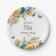 Platos de papel para fiestas de 70 años con hermosos rosas amarillos y polvorientos azules y flores y mariposas de color crema. Estas placas se pueden personalizar para cualquier edad. Contáctame para obtener ayuda con tus personalizaciones o para solicitar productos adicionales de correspondencias o coordinación de Zazzle para tu celebración.