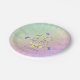 En estos platos de papel de bonito se exhibe un arcoiris de celebración de colores, flores rosas y mariposas de lavanda para una fiesta de cumpleaños 16 de los chicas.