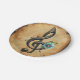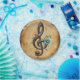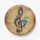Mechanical clef and flowers to the beat of the clocks. A steampunk-style treble clef, rendered in dark metal with bronze accents and intricate detailing. The clef is adorned with blue flowers that have clock faces at their centers, adding a whimsical touch. Musical notes float near the clef, and small droplets hang from its curves.