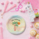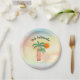 These island style paper plates feature hand drawn palm trees decorated with lights on a watercolor background.