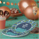 Añade tu propio mensaje para crear los suministros de fiesta personalizado perfectos para cualquier ocasión. Estas placas de papel presentan ilustraciones de cámaras desechables de estilo retro en tonos azules, verde azulados y verdes contra un fondo azul marino con tu mensaje personalizado en letras blancas.