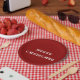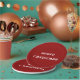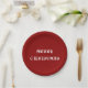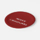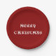 Papel de tamaño de postre rojo oscuro con "Feliz Navidad" en una fuente blanca y nevada.