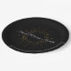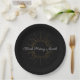 Trae elegancia a tu fiesta de vacaciones. Este plato de papel negro tiene un sencillo sol dorado y elegantes letras.