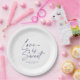 Añade un toque de elegancia a tu mesa de postre con este plato de papel blanco con la frase "Amor es Dulce" en un guión marino clásico. Perfecto para bodas, fiestas de compromiso o duchas de novias, este diseño le aporta un encanto atemporal y simplicidad moderna a su celebración. Personalízalo con los nombres o la fecha de su boda para un detalle personalizado que sus invitados adorarán.