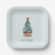 Minimalist mint green Christmas-themed paper plates with a snowy pine tree and a customizable text "Merry Christmas" at the bottom.