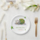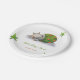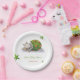 Cuidados platos neutros de papel para la ducha con un ilustracion de triceratops eclipsando su huevo. Personalízalo con su propia información. Ilustrado y diseñado por Patricia Álvarez.