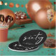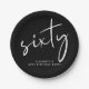 Platos de papel negro de moda para tu fiesta de cumpleaños número 60 que presentan "sesenta" mostrados en un gran guión blanco.