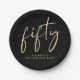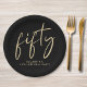 Elegantes platos de papel negro de la fiesta de cumpleaños número 50 con "cincuenta" exhibidos en un moderno guión de oro de moda.