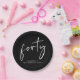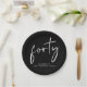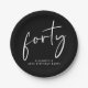 Eleva tu decoración fiesta de 40 años con estos platos de papel negro de moda con "cuarenta" exhibidos en un moderno guión blanco.