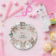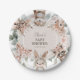 Placas de papel de Baby Shower para animales de la moda Boho Woodland. El diseño presenta una pieza central ovalada que muestra los detalles de los eventos, enmarcada con las pequeñas criaturas acuarelas más curiosas y follaje botánico con flores rosadas.