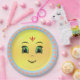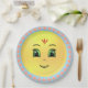 Moderno y lindo rostro de sol feliz y corazones rosados en la placa Fiesta de papel azul claro.
