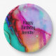 Placas personalizadas de papel de cumpleaños (u otro evento) con un diseño artístico abstracto elegante. Pintura acuarela con colores que mezclan y mezclan creando un bonito patrón de mármol fluido.
