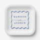 Añada un toque elegante a su recepción de bodas, cena de ensayo, fiesta de compromiso o ducha de boda con estos platos de papel de marco ondulado azul moderno. Las placas retro de papel boda muestran los nombres de la pareja en negrita con letras azules rodeadas de un borde ondulado azul que contrasta con un fondo blanco. Las placas de papel boda de moda fueron diseñadas para coordinarse con nuestra colección de bodas Wavy Frame Modern.