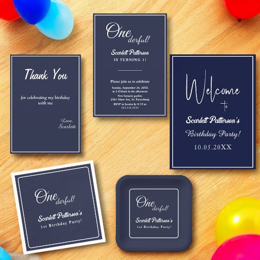 Esta elegante placa de papel azul marino y blanco es perfecta para un cumpleaños moderno. el diseño es sencillo y elegante, con una caligrafía blanca sobre un fondo azul marino.