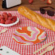Moderno Retro Liquid Swirl Colorful Abstract Pattern Plaza Naranja Rojo Rosa Beige. El pop contemporáneo estético de los 90 años del año 2000 del boho; un poco trippy y psicodélico. Por Kierkegaard Design Studio.