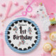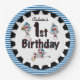 Patines de papel de primer cumpleaños del Béisbol del mono del rock, un diseño lindo que es genial para los niños que aman los deportes, especialmente el béisbol, ¡y monos lindos! Cuenta con tres jugadores de béisbol de monos calcetines en gorros de béisbol, uno deslizándose en el plato, uno en el bate, uno preparándose para lanzar la pelota. El texto con puntos de polka negro dice 1er cumpleaños y hay un borde de rayas azules y blancas y un anillo decorativo negro. ¡Se puede fácilmente personalizar estas placas de papel de primer cumpleaños de mono calcetín con un nombre!