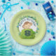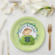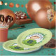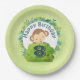Un juego de placas de papel con un ilustracion personalizado de un mono pequeño mirando hacia fuera desde detrás de un arbusto verde. Rodeado por una corona de hojas tropicales. Situado sobre un fondo de color verde oliva. El texto del personalizable dice Feliz cumpleaños y la edad del invitado de honor.