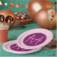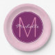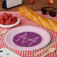 Personaliza con un primer monograma y un nombre en un lujoso círculo violeta. El fondo es rosa con pequeños y lindos puntos blancos de polka.