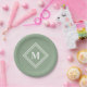 Este diseño moderno y elegante presenta un marco de diamante de doble línea blanca sobre un fondo verde suave y un monograma en una fuente de bloque elegante. Cambie la inicial a la suya. Puede personalizar aún más este diseño cambiando la fuente, haciendo que los blancos sean transparentes y eligiendo un color diferente. Perfecto para bodas y reuniones