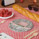 Bonito de estilo rústico monogramado en placa de papel de tarro de masón con una flor de horangea rosa y una valla de madera y fondo de encaje antiguo de patrón damasco y cinta de coser de color rubí. Esta ducha boda o nupcial, o una ducha de pareja, un plato de fiesta de compromiso o aniversario personalizado con las iniciales y el monograma de la pareja feliz o novia y novio en el tarro de albañil es perfecto para una ocasión o celebración especial de campo, casa de campo, fiesta de jardín o estilo de jardín. Diseñado por Chrissy H. Studios, LLC. Todos Los Derechos Reservados.