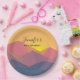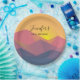 Placas de papel de cumpleaños con un ilustracion gráfico con muchos topes de montaña con luz solar amarillo brillante detrás de las montañas. Fabricado con formas geométricas poligonales.Diseño minimalista simple. Los colores van desde el azul oscuro hasta el rojo desierto.