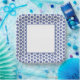 Mosaico de elementos geométricos florales azul marino, verde, violeta y blanco