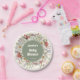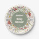 Mushroom Baby Shower paper plates featuring whimsical watercolor toadstool mushrooms, wildflowers, lavender, and leafy greenery with an earthy sage center. Cute table wear and party decorations for a forest mushrooms themed baby shower, perfect for a Whimsical, cute, Earthy Baby Shower aesthetic. Ideal for dessert tables, brunch spreads, snacks, and cake, adding a cozy woodland/boho rustic touch to your baby shower setup.
