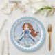 Este adorable y nevado plato de papel Princess en invierno presenta a una hermosa princesa joven con el pelo rojo vestido con un bata de copo de nieve azul y blanco y una capa de piel cálida. La princesa está rodeada de puntitas.