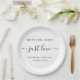 Platos de papel de moda para la recepción de tu boda, cena de ensayo, fiestas de compromiso y otros eventos bodas con "Nothing Fancy Just Love" en una mezcla de tipografía simple y un guión elegante, y tu nombre y fecha boda en tipografía serif clásica.