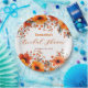 Este impresionante plato de papel presenta un borde exuberante de ricos naranjas y espías rojas profundas, cuyos pétalos se despliegan como susurros de puesta de sol. Los clubes de bayas rojas y el delicado follaje otoñal están muy bien entrelazados, creando un marco pintoresco que evoca un sueño de cosecha rústico y acogedor. Es más que un plato; es una obra maestra en miniatura lista para elevar tu celebración. Lo mejor de todo es que el nombre de la novia y la fecha del evento son totalmente personalizables, lo que le permite personalizar este diseño único sin esfuerzo.