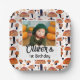 Placas de papel de la fiesta de cumpleaños de la foto de la caída del hongo naranja. Un adorable patrón de naranja y hongos negros en colores otoñales, nombre y foto de un niño personalizado. Una encantadora decoración de Halloween o fiestas de cumpleaños de otoño.